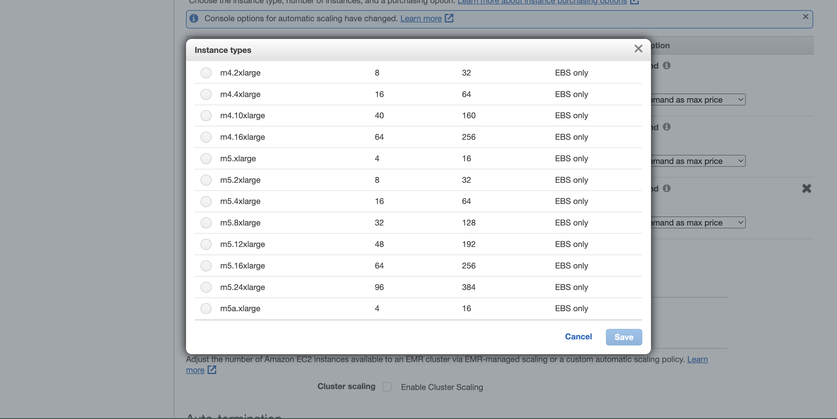 이 때 보이는 Instance Type의 사양에서 vCore는 EC2의 vCore 가 아니라 Yarn의 vCore개수를 의미하며, 링크 에서 각 인스턴스 타입에 해당하는 Yarn Memory 등 Hadoop Default 설정을 확인할 수 있다.