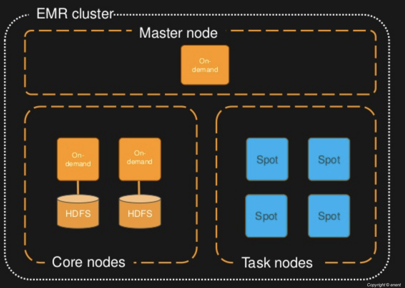 클러스터를 구성할 때 작업의 성격에 따라 각 Node들에 해당하는 리소스를 적절히 설정하여야 하며 NameNode, ResourceManager를 포함하고 있는 Master Node, Datanode를 포함하고 있는 Core Node는 On-demand로 설정해야 한다. (기술적으로 필수인 것은 아니지만 데이터 유실의 위험성 존재 및 클러스터 안정성을 위함)
