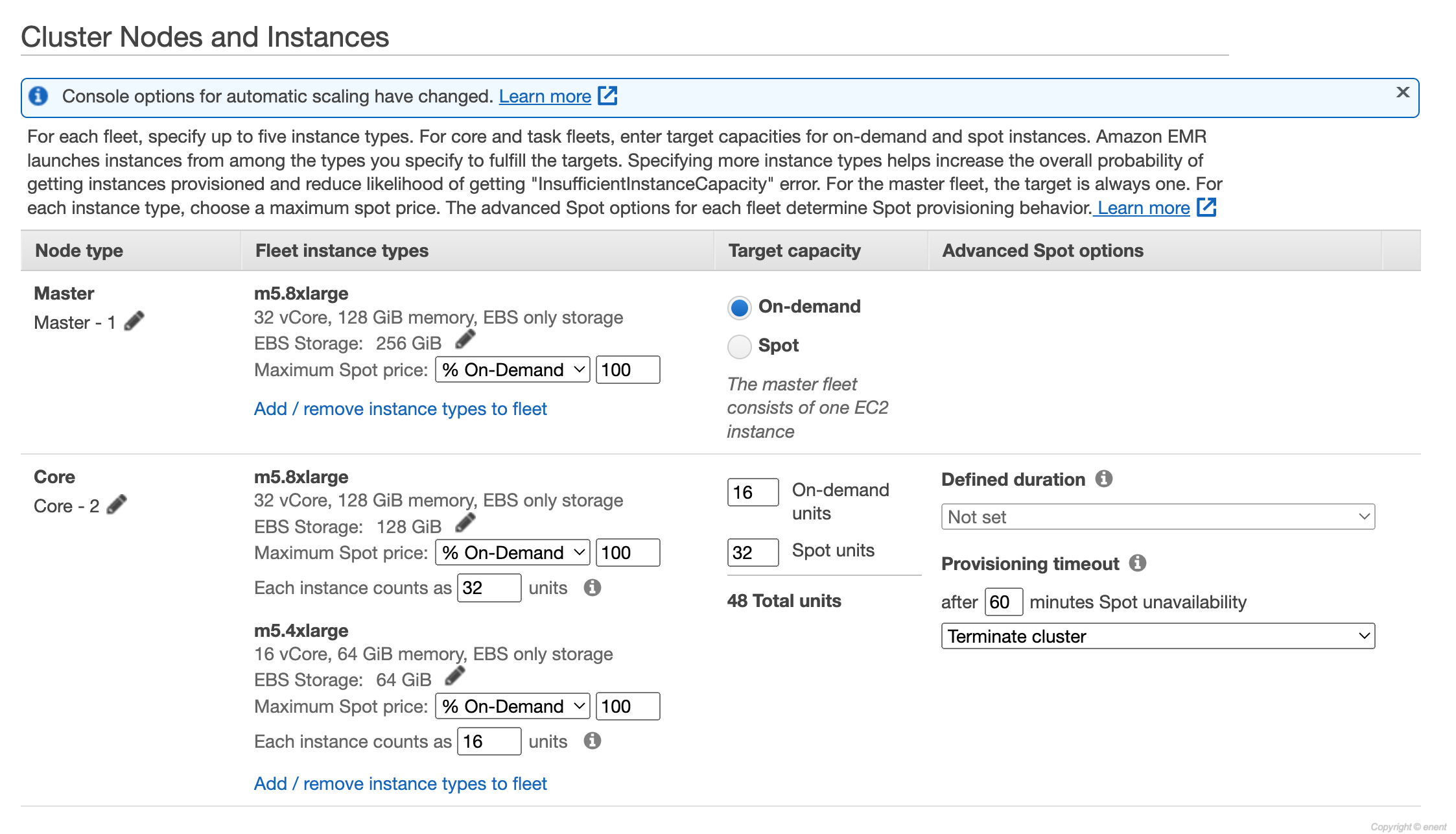 이렇게 각 노드 별로 각각의 Instance Fleets 집합을 구성할 수 있으며, 각 Node 당 최대 5개의 타입으로 구성할 수 있다. 각각의 Instance 타입마다 Bidding 가격과 최대 사용 용량 (Unit)을 지정하며, Unit별 On-Deamnd 와 Spot 의 비율도 설정할 수 있다.