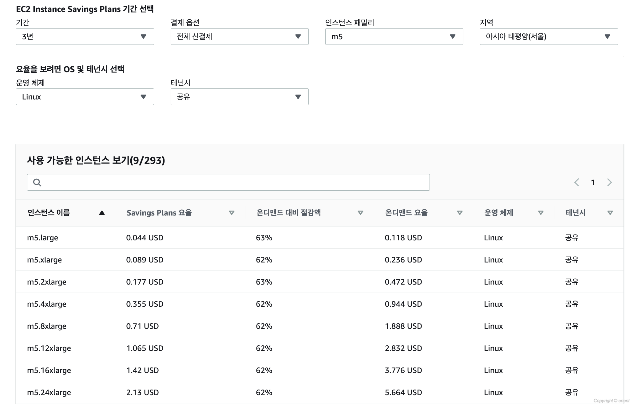보면, 같은 인스턴스 타입 / 같은 조건 ( 선결제 옵션 , Region 등) 적용 시 RI 와 Saving Plan은 같은 요금 할인율을 보여주고 있다.
