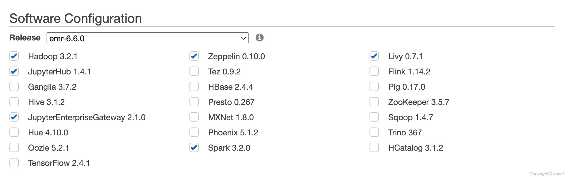 EMR 내에는 Hadoop, JupyterHub, Hive, Zeppelin, Flink, Spark, Hue 등 다양한 분산처리 및 노트북 환경들을 제공한다. 아래와 같이 내가 필요한 서비스의 버전을 확인하고 EMR 버전을 선택하면 되며, Cloudera에서 제공하듯 체크하는 것으로 서비스들의 설치를 진행할 수 있다. EMR의 지속적인 Version up을 통해 각 컴포넌트들의 업데이트를 지원해주고 있다.